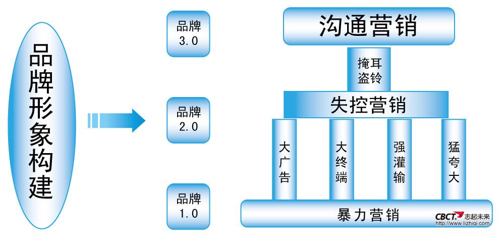 品牌1.0是暴力营销的时代,以大广告、大终端、强灌输、猛夸大为特点,在改革开放初期广告效果明显。品牌2.0是失控营销时代,使用暴力营销的厂家越来越多,广告花费越来越大,而消费者被暴力营销练出了广告免疫能力,营销效果却越来越差。